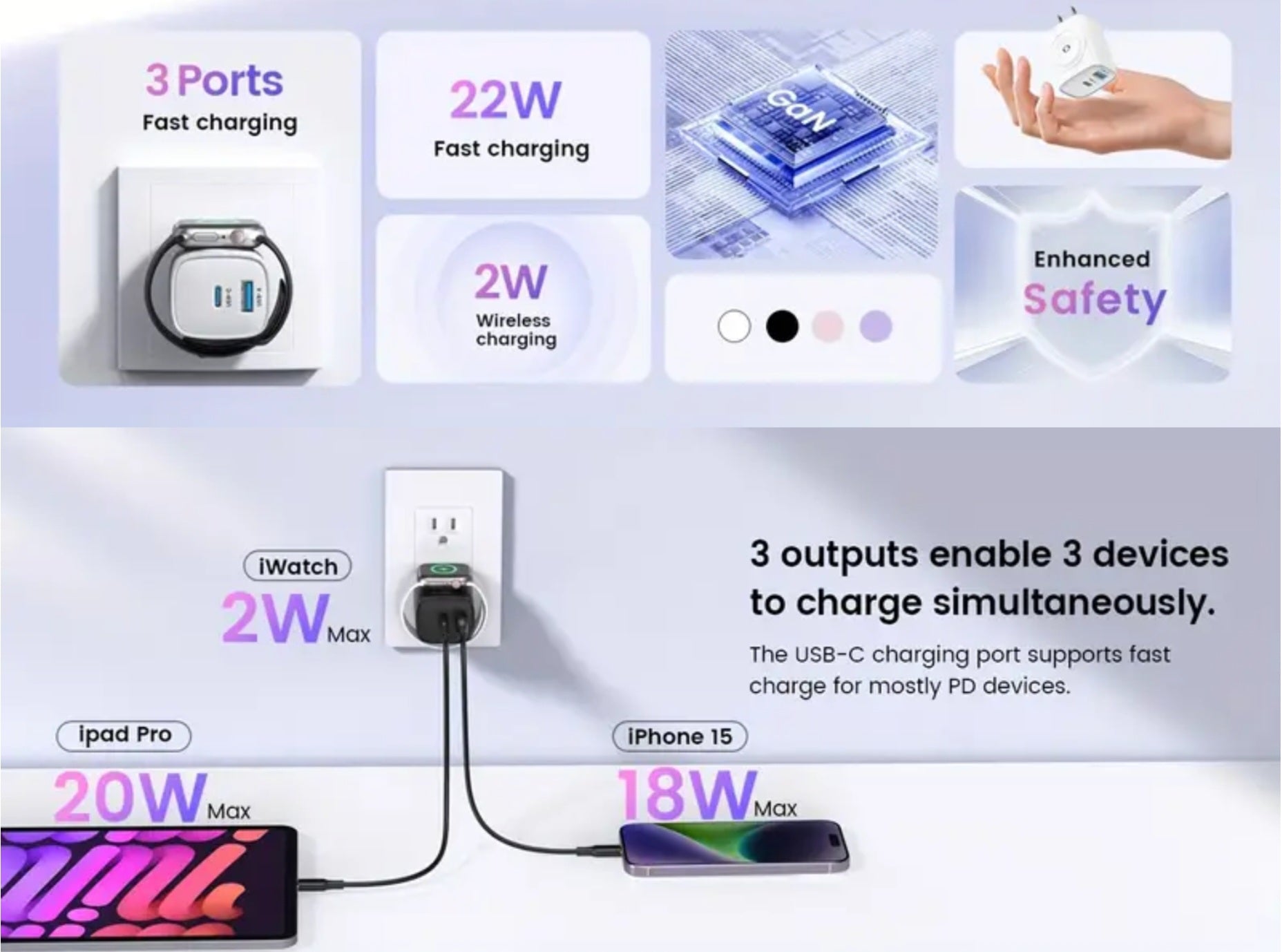 For Apple Watch Charger, 22W 3-in-1 Fast Charging Block With Magnetic Wireless Charging And Dual Ports, Portable USB C PD Travel Plug Compatible With IPhone, Apple Watch Series, White
