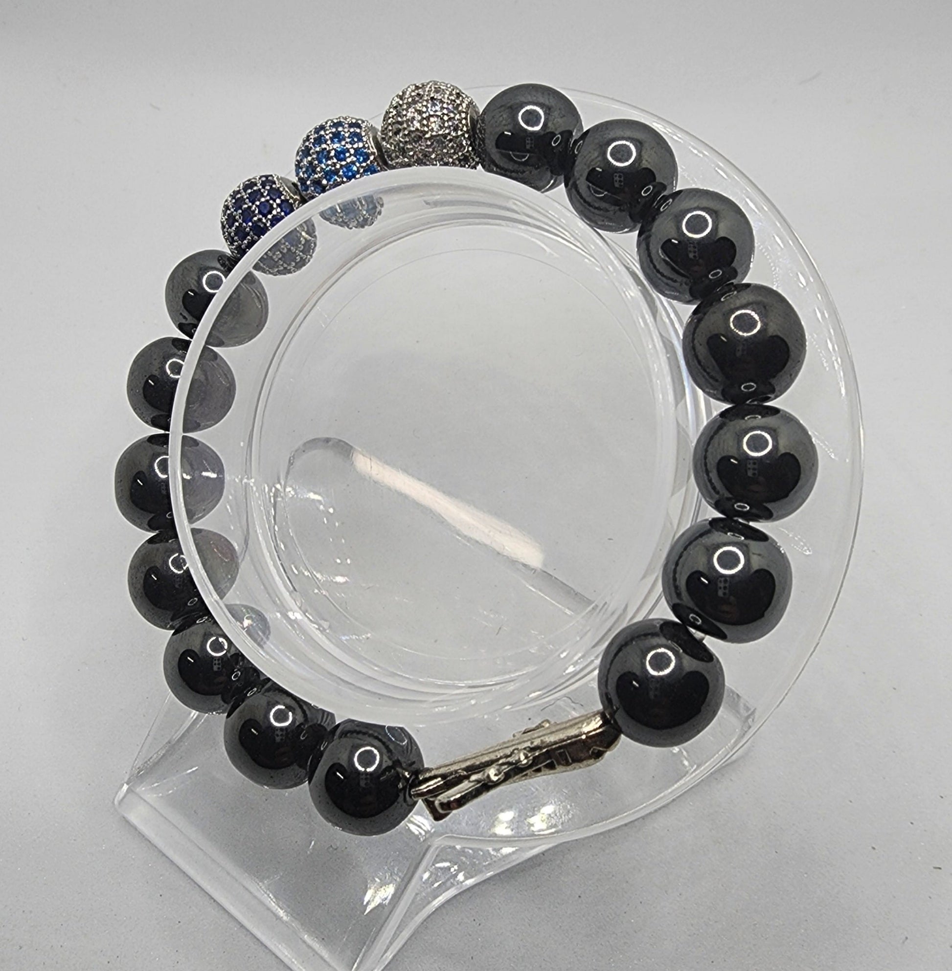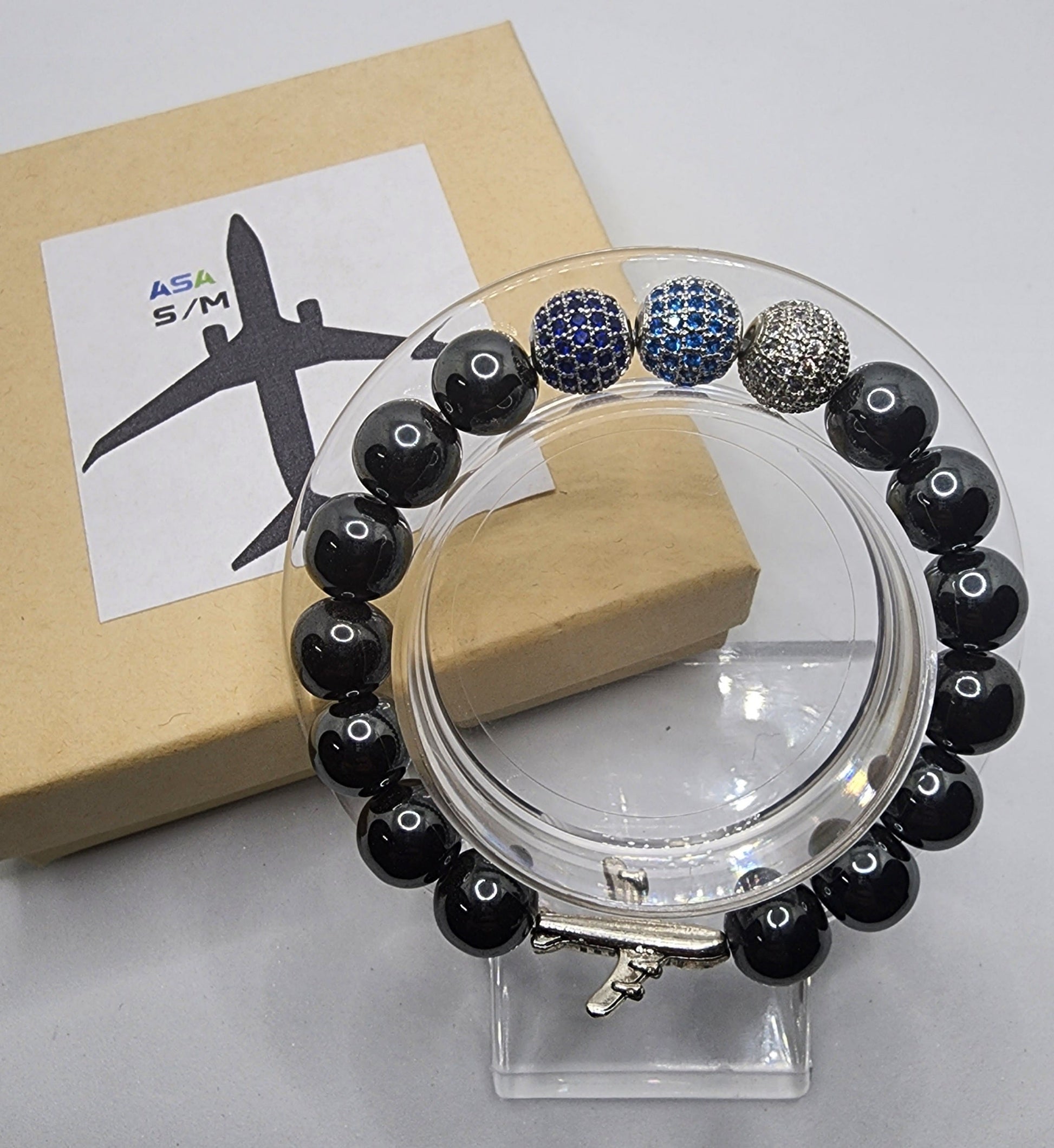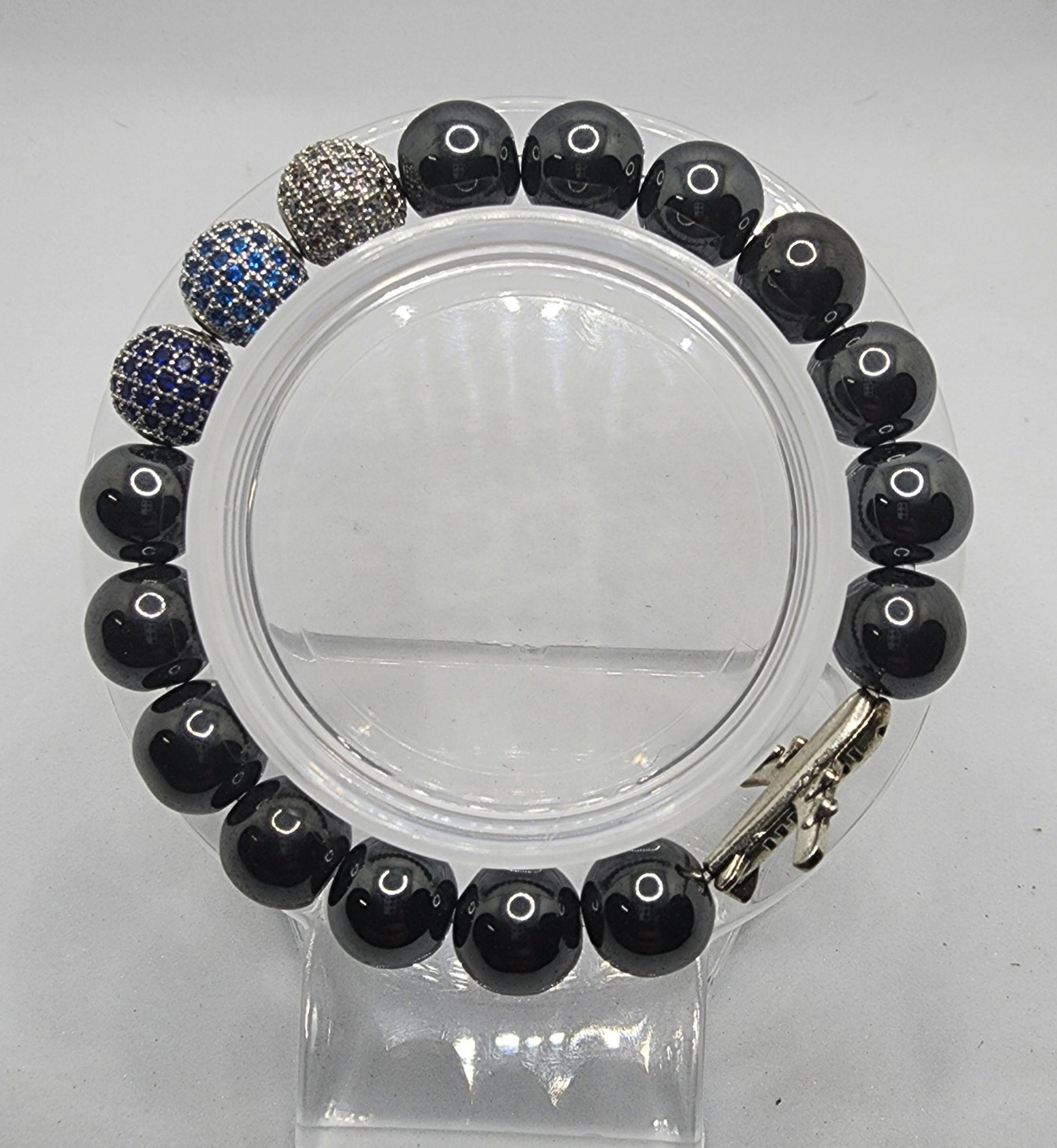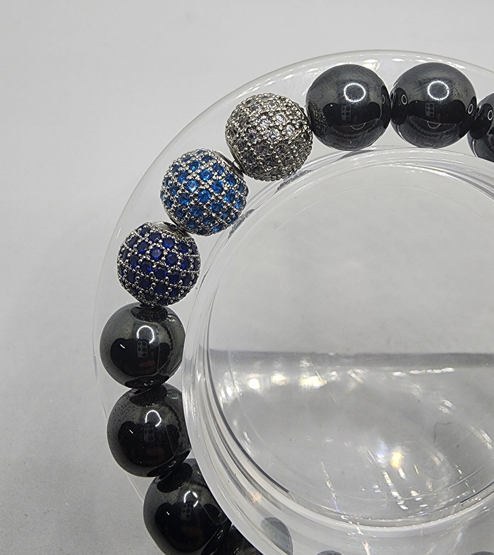 Made with Black Hematite Beads, 3 cubic Zirconia Crystal Beads, a Charm, and Super Strong Elastic Cord. All are handmade to order, comes in a cute bracelet box as well!
