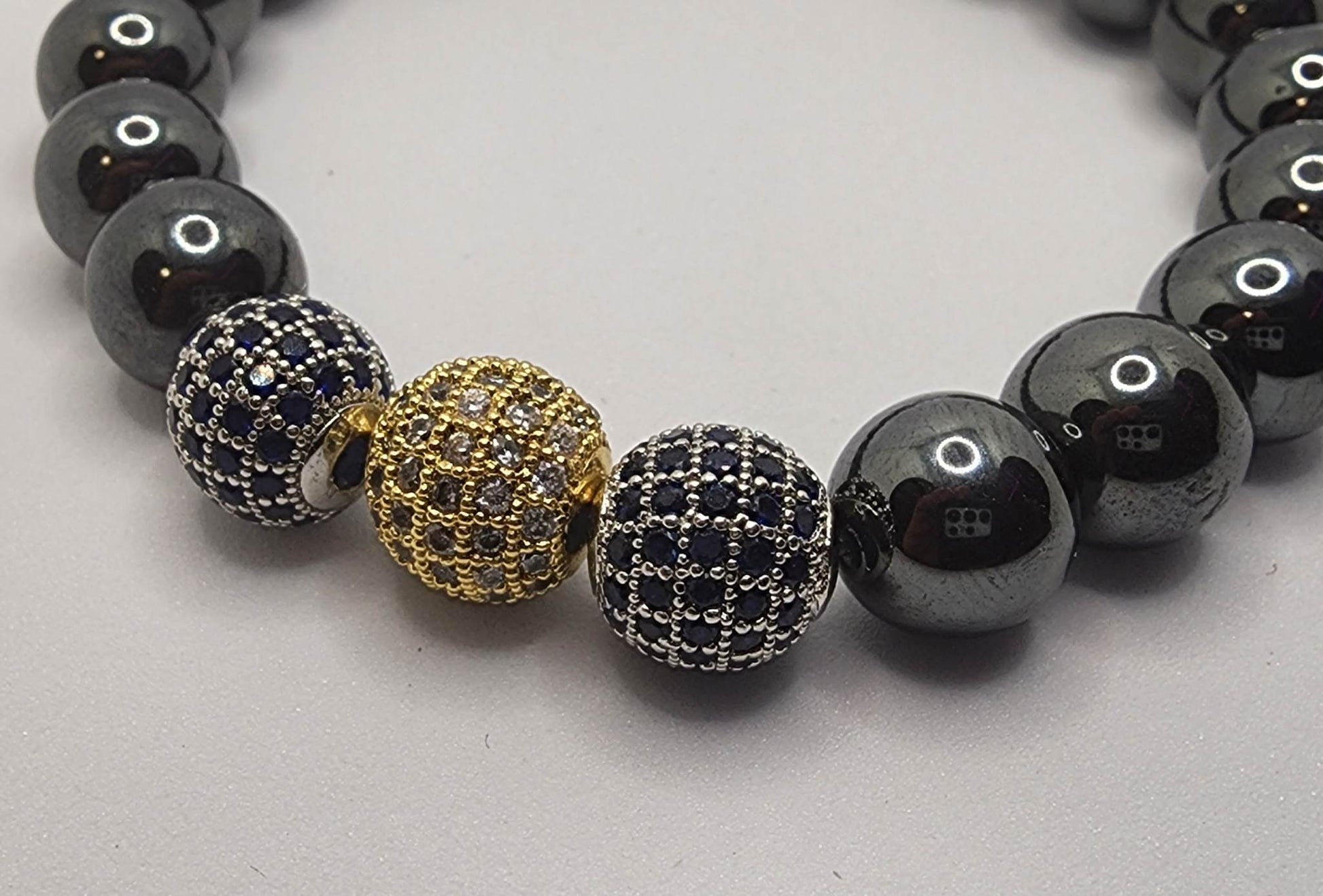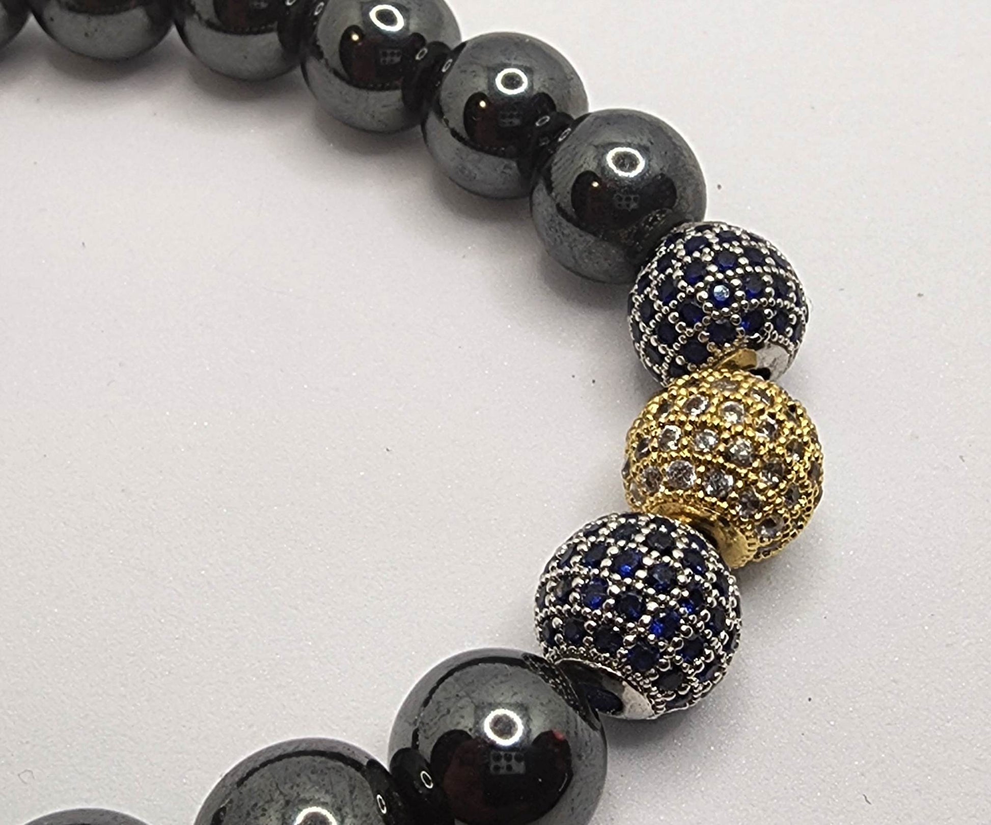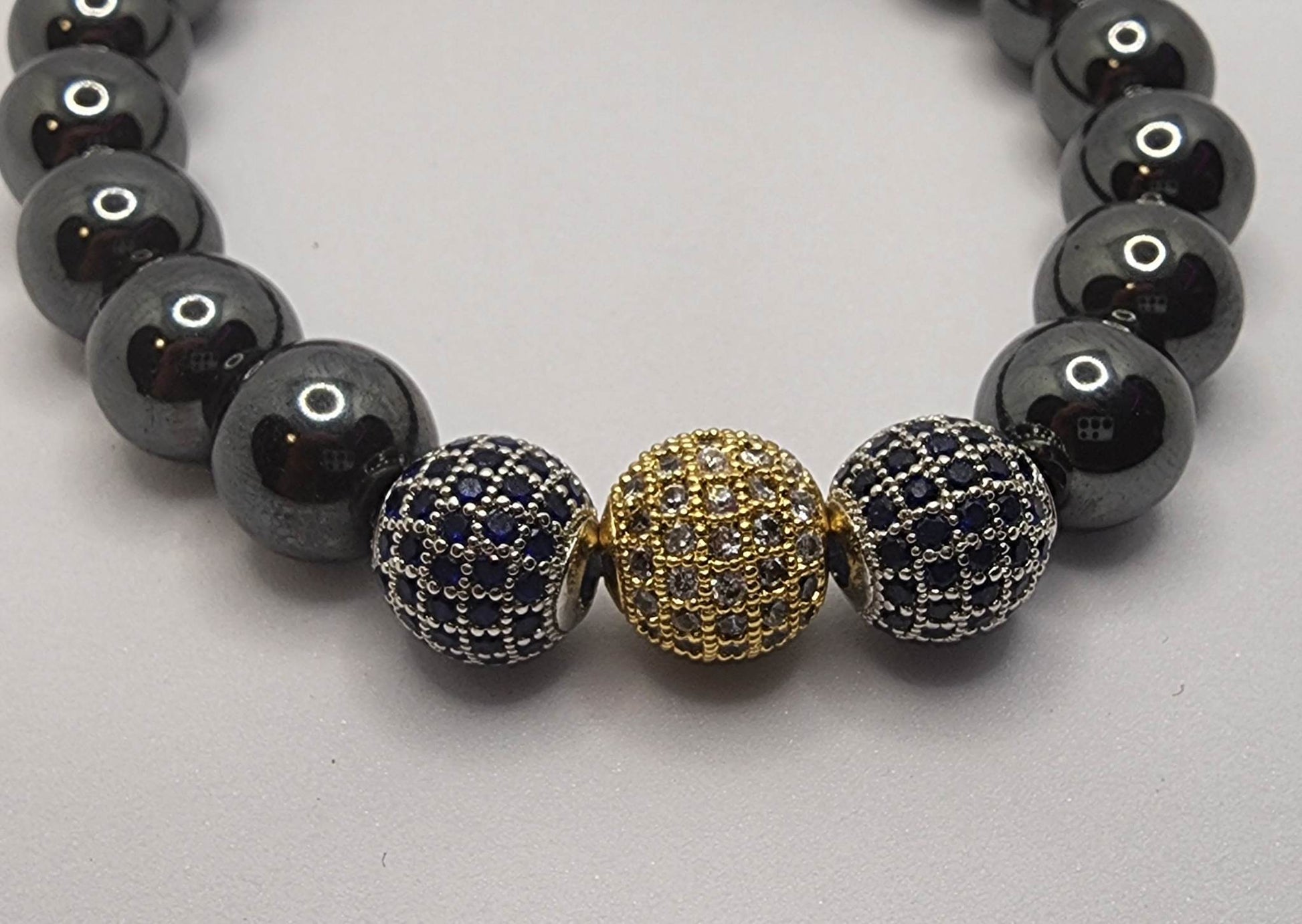 Made with Black Hematite Beads, 3 cubic Zirconia Crystal Beads, a Charm, and Super Strong Elastic Cord. All are handmade to order, comes in a cute bracelet box as well!