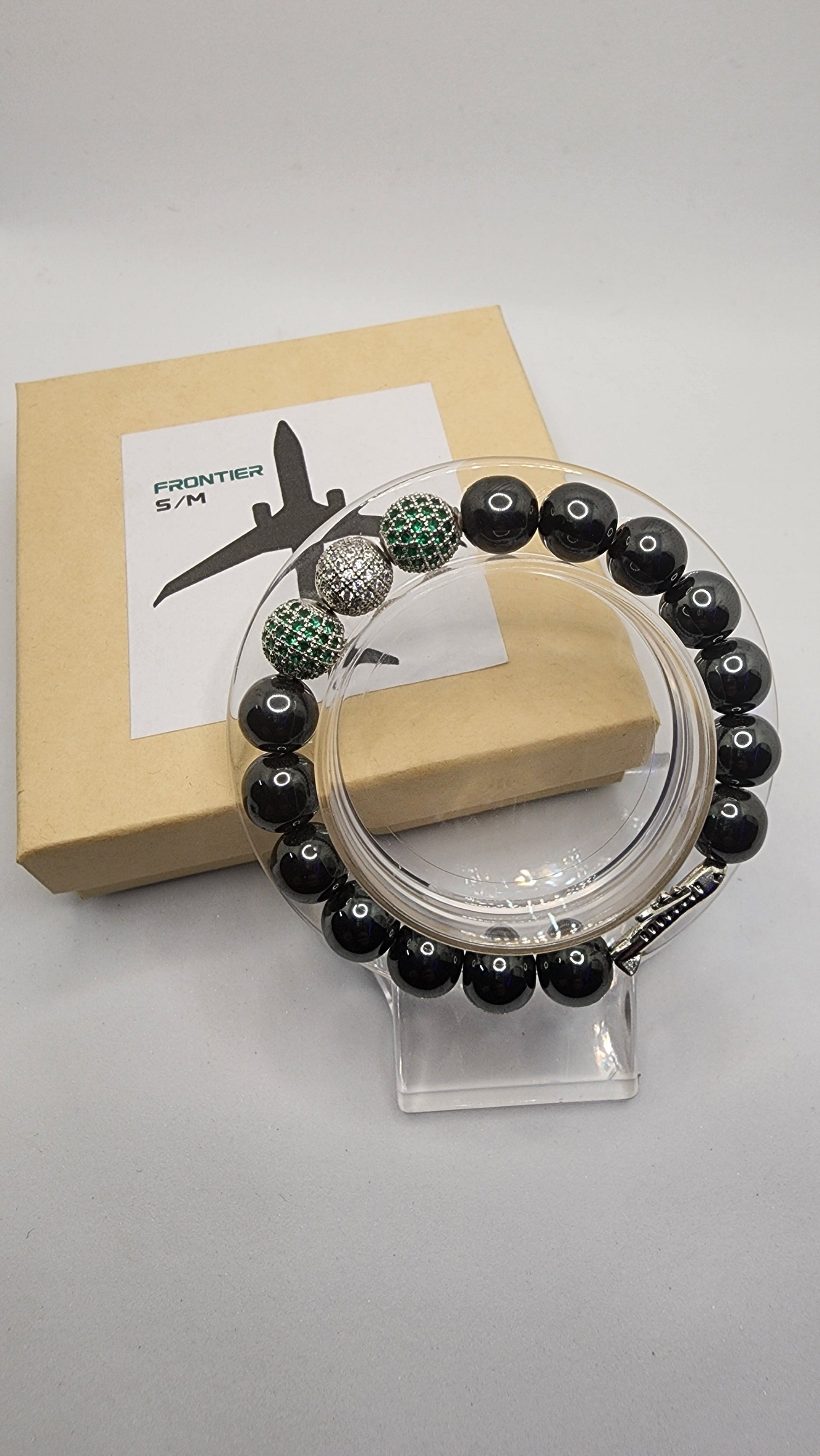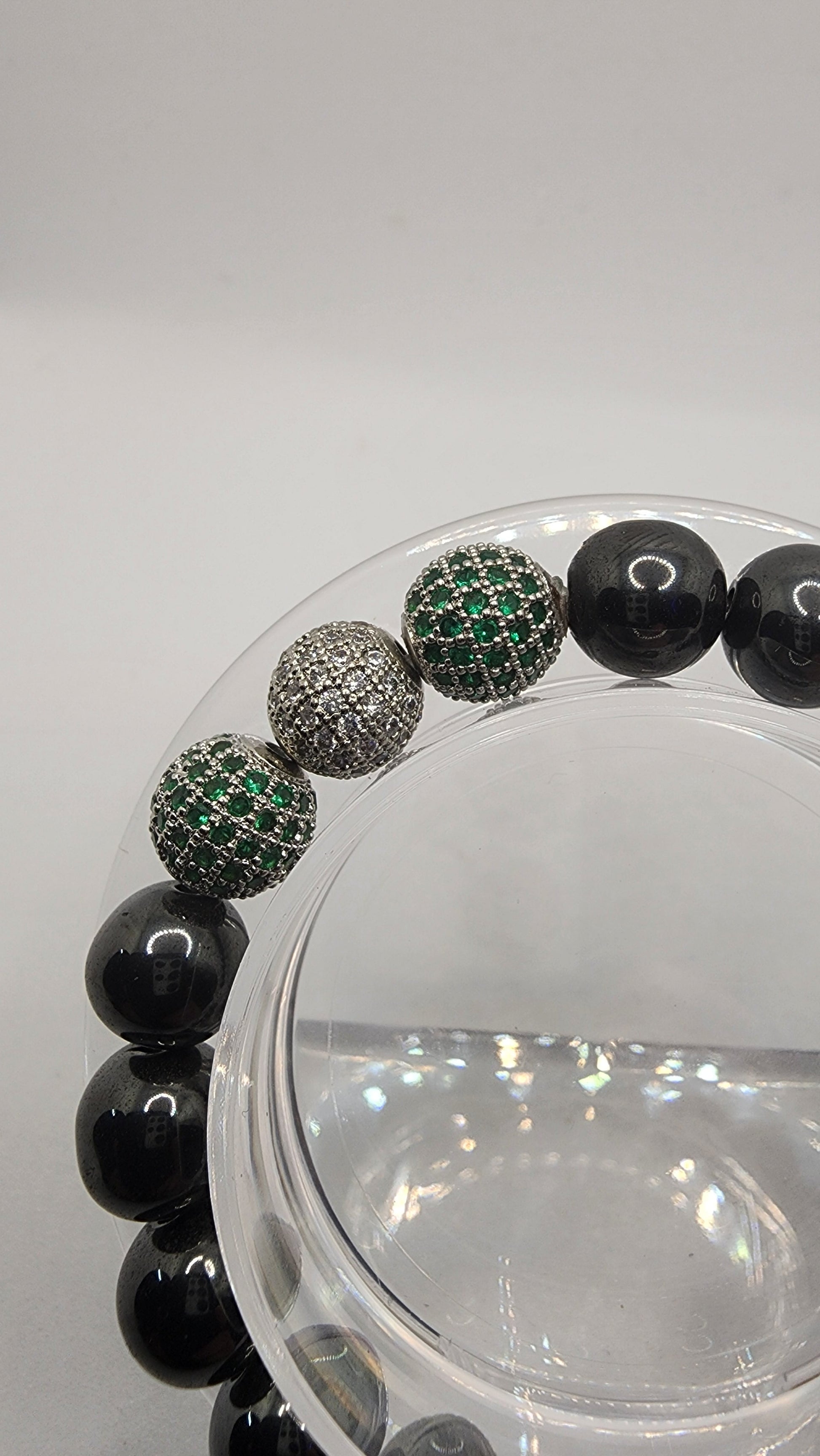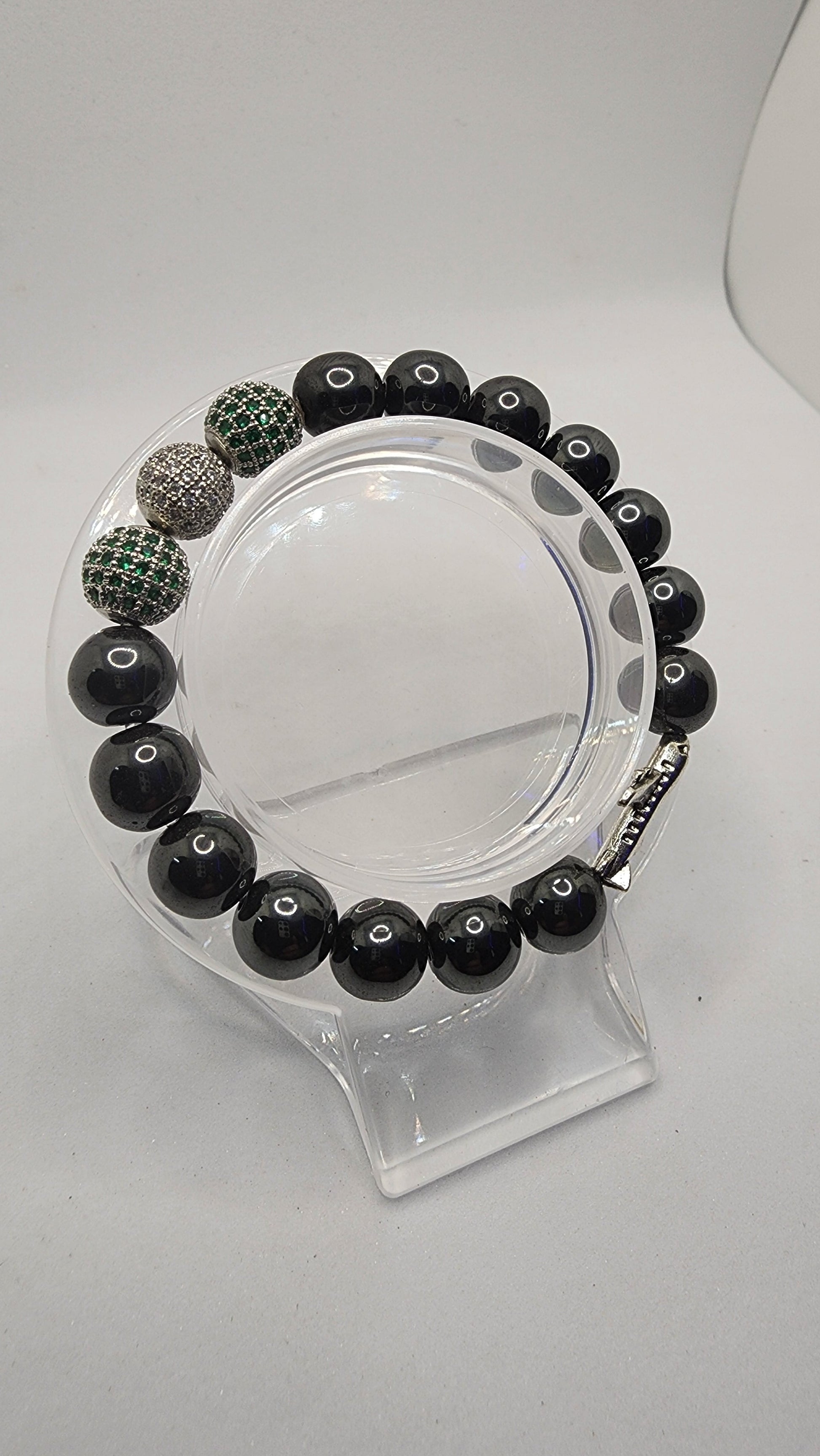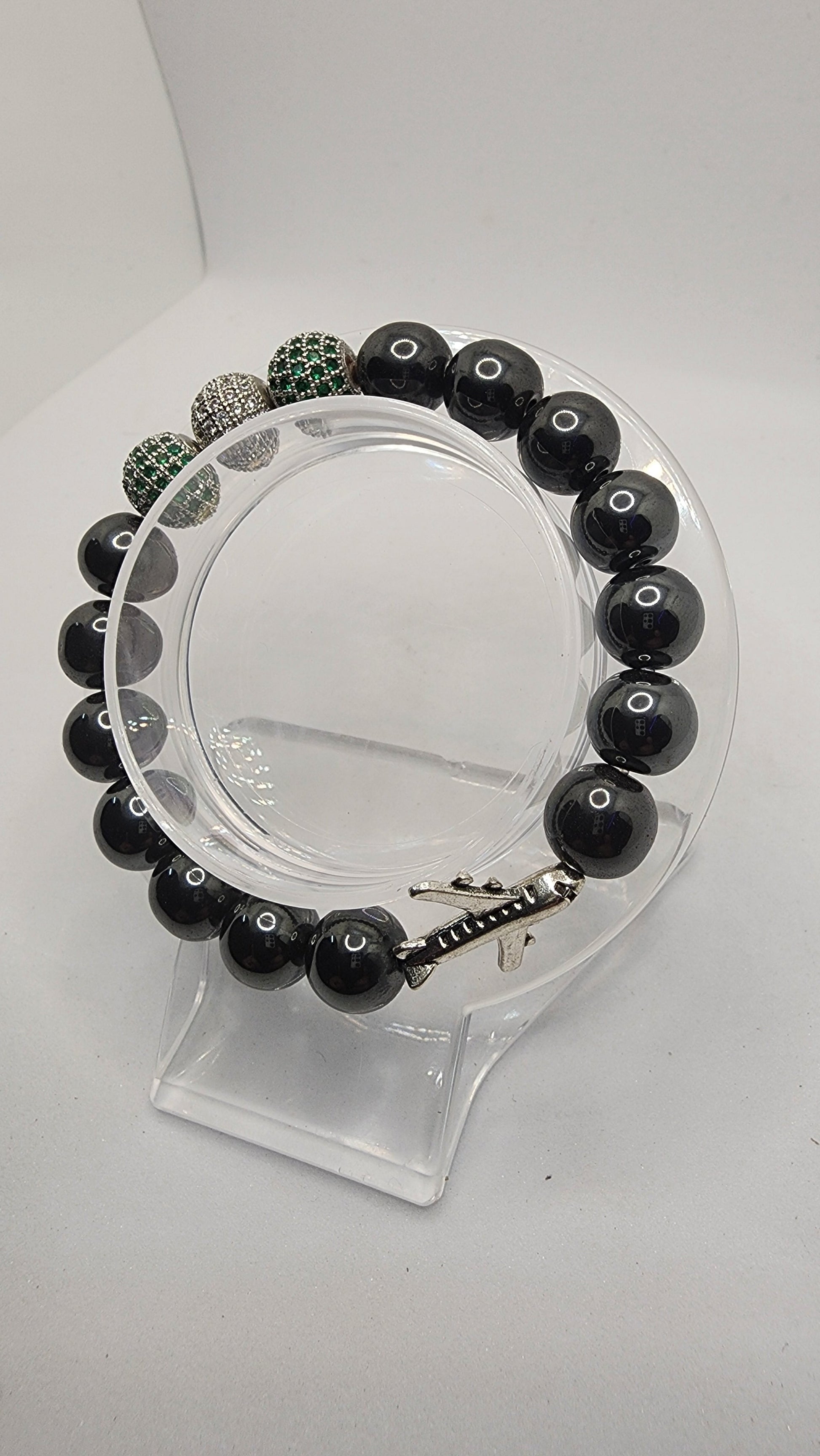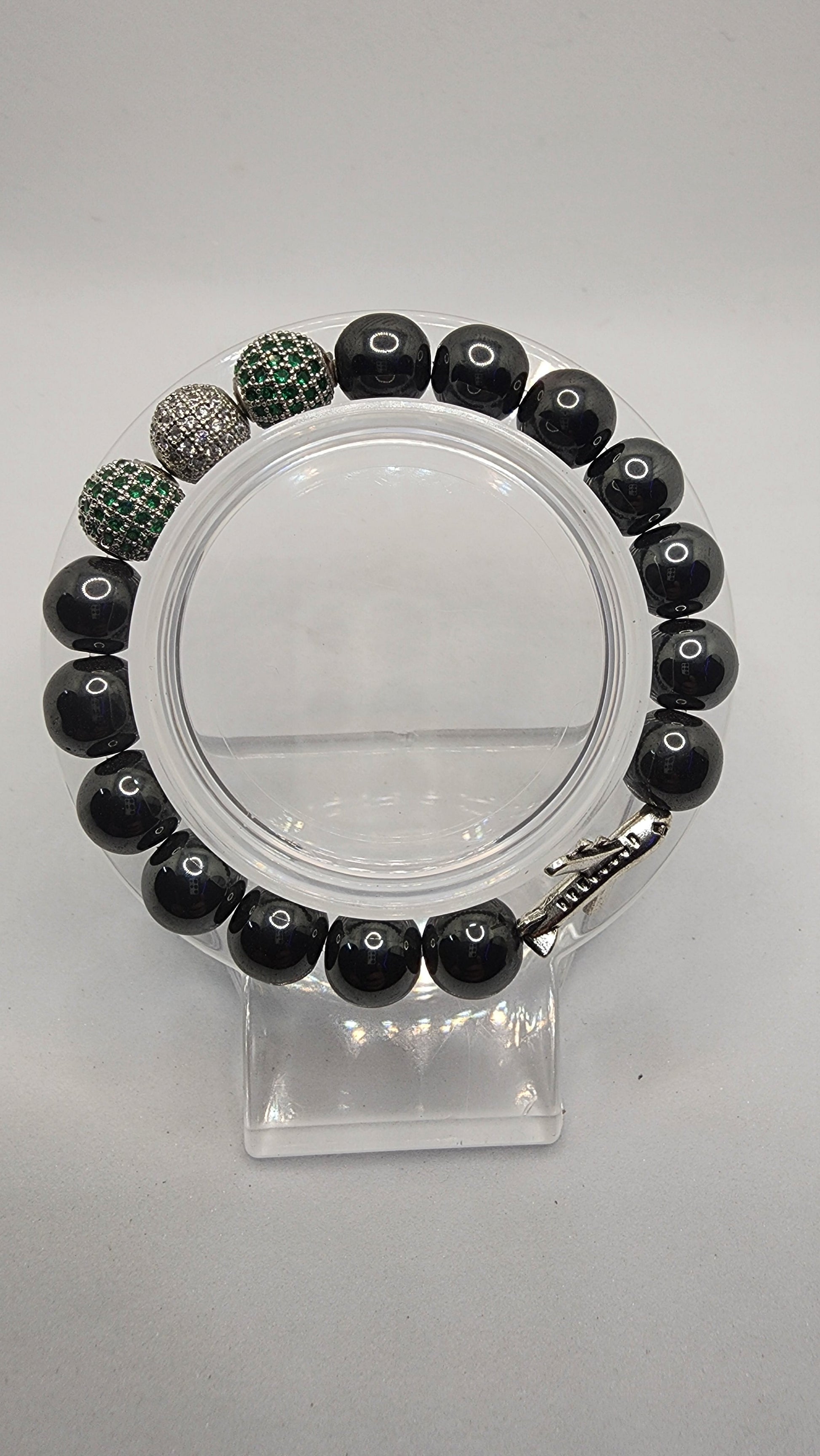 Made with Black Hematite Beads, 3 cubic Zirconia Crystal Beads, a Charm, and Super Strong Elastic Cord. All are handmade to order, comes in a cute bracelet box as well!