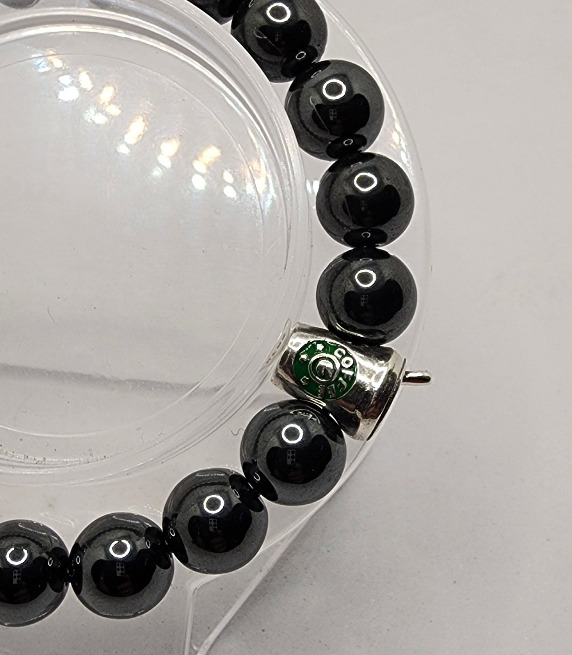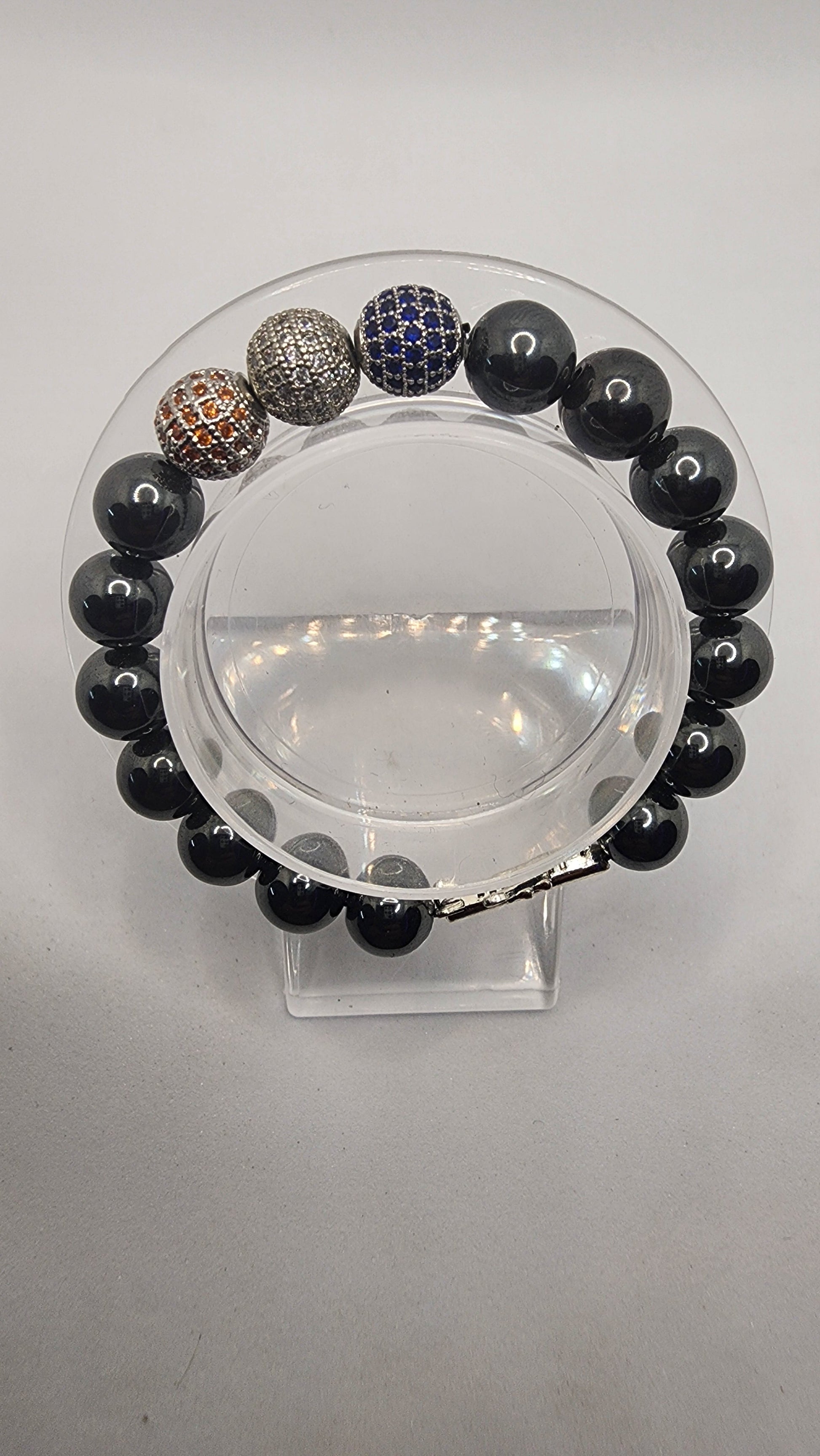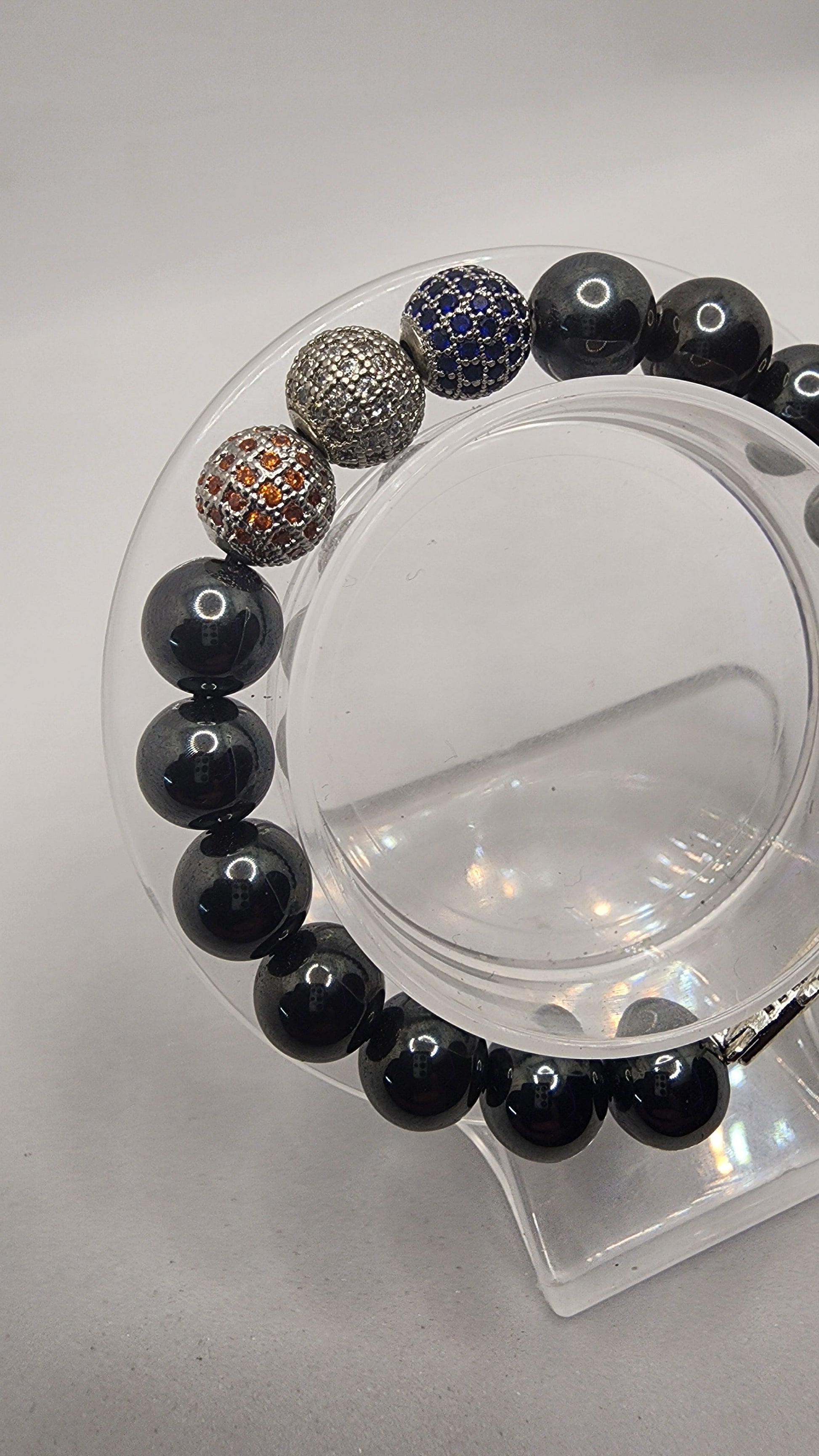 Made with Black Hematite Beads, 3 cubic Zirconia Crystal Beads, a Charm, and Super Strong Elastic Cord. All are handmade to order, comes in a cute bracelet box as well!